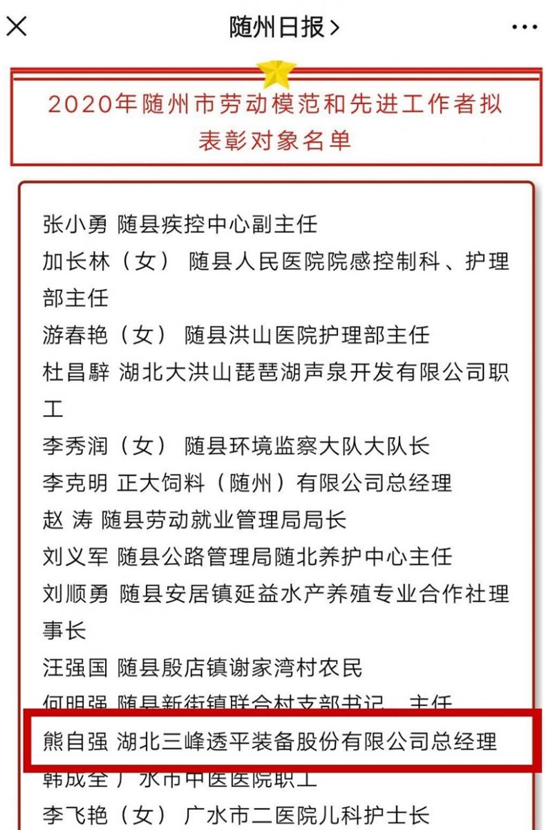 2020年4月23日,隨州市勞動模范和先進(jìn)工作者推薦工作領(lǐng)導(dǎo)小組公示了2020年隨州市勞動模范和先進(jìn)工作者表彰對象,我公司總經(jīng)理入選在列。